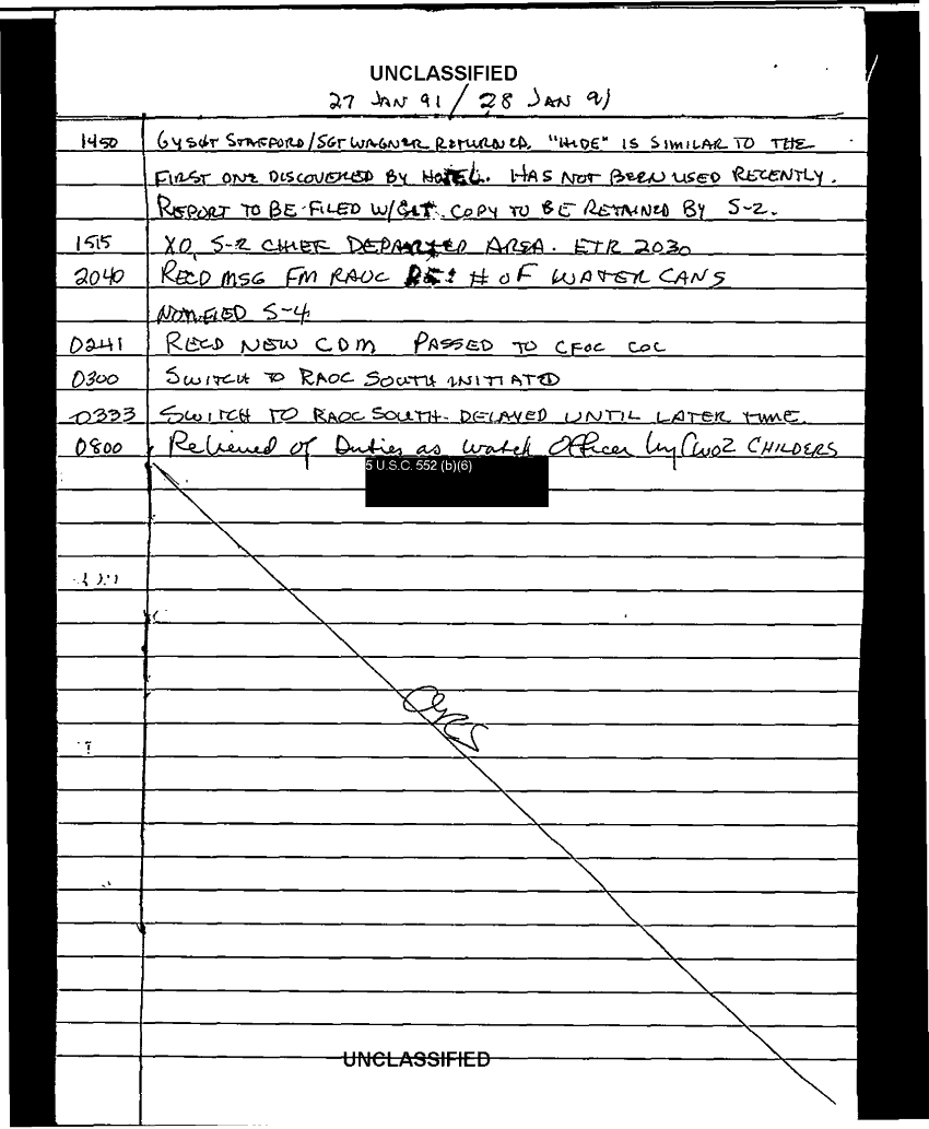 Document 103 f:/Week-35/BX600013/COMMAND CHRONOLOGY 3RD BATTALION 24TH MARINES JAN - MAR 1991 4 OF 4/handwritten log:0102970950272