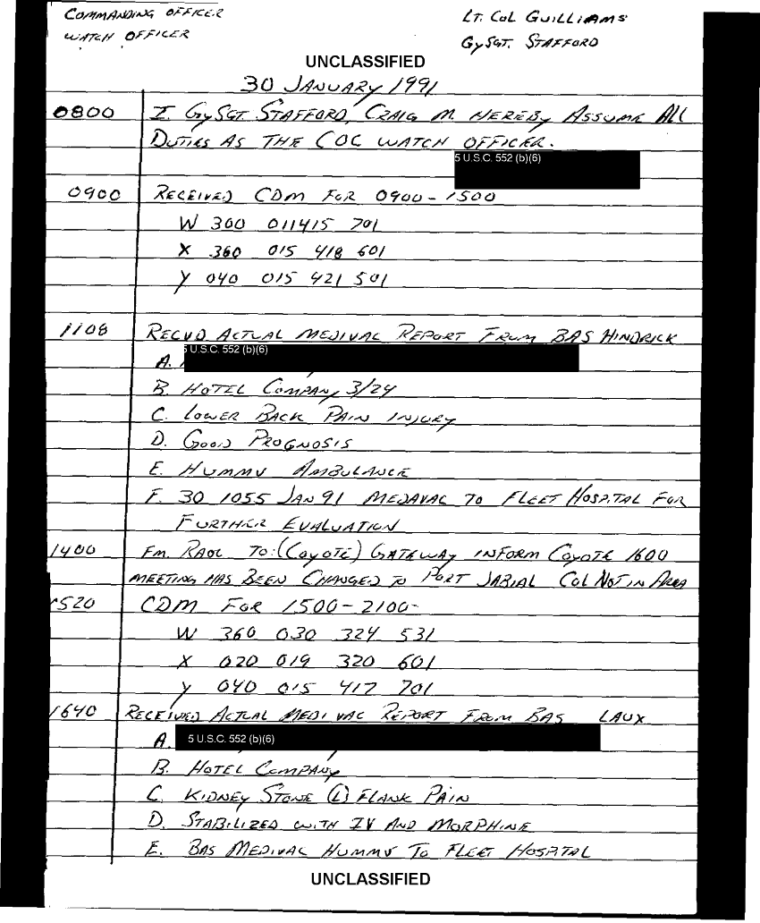 Document 103 f:/Week-35/BX600013/COMMAND CHRONOLOGY 3RD BATTALION 24TH MARINES JAN - MAR 1991 4 OF 4/handwritten log:0102970950272