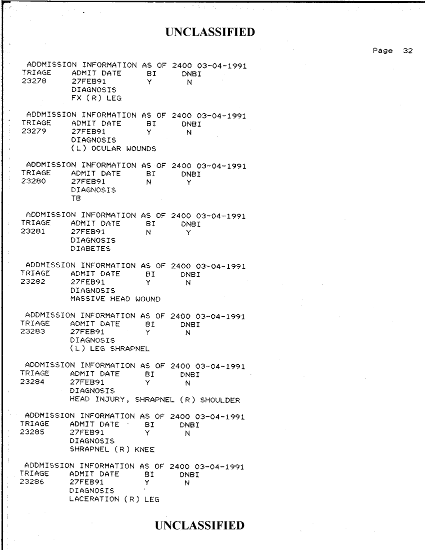 Document 34 f:/Week-42/BX300118/FOLDER 2 - PATIENTS TREATED - AL KHANJAR TRAUMA CENTER MAR 91/admission information as of 2400 03 04 1991:1112:1112961728162