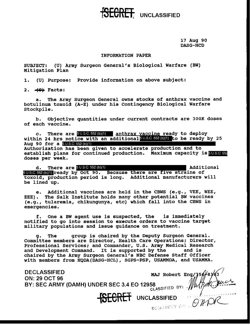 Subject = ARMY SURGEON GENERALS BIOLOGICAL WARFARE MITIGAT