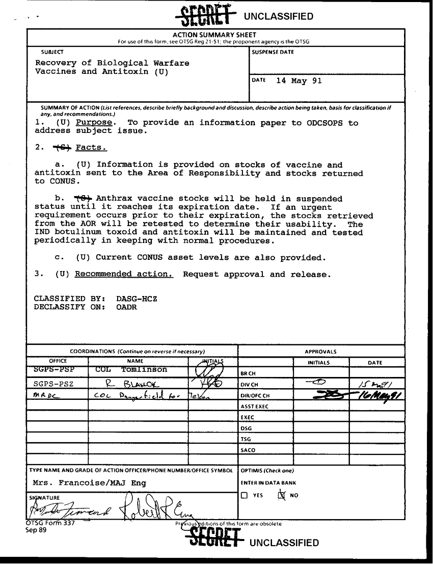 Subject = RECOVERY OF BIOLOGICAL WARFARE DEFENSE VACCINES