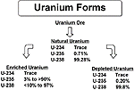 Natural uranium (extracted from uranium ore) is processed to form enriched uranium for nuclear power. Depleted uranium (DU) is the by-product of this uranium enrichment process. Natural uranium is composed of three isotopes, uranium-238 (238U), uranium-235 (235U) and uranium-234 (234U). Although the exact percentages vary slightly, natural uranium typically is composed of approximately 99.28% 238U, 0.71% 235U, and 0.0055% 234U (See Figure 10). Isotopes of an element have essentially the same chemical and physical properties because they have the same number of protons (92) in their atoms. They differ only in the number of neutrons per atom. For example, 234U, 235U, and 238U have 142, 143, 146 neutrons in each atom, respectively. It is this variation in the number of neutrons that gives the different isotopes their radiological properties. Isotopes differ in the types of radiation emitted during the nuclear decay process, decay rate, interactions with nuclear particles, and ability to undergo nuclear fission.[45]