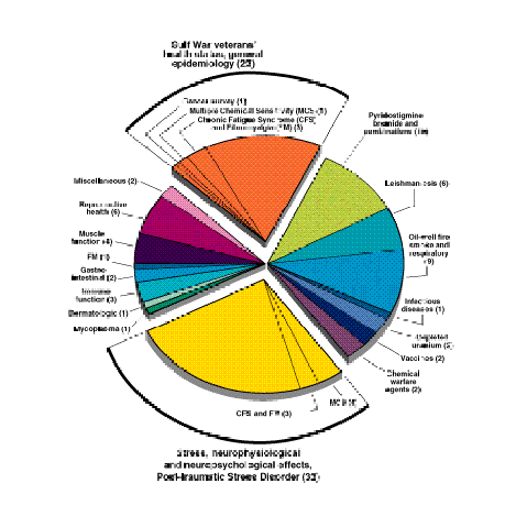 Gulf War risk factors and health outcomes. Health outcomes for Gulf War veterans under investigation in Fall 1996 included reproductive health; diarrhea and gastrointestinal disorders; irritable bowel-like disorders; immunological function; respiratory function; fibromyalgia; musculoskeletal symptoms; sensitivity to chemicals; fatigue, stress, mental health, and neurophysiologic and neuropsychologic status (including PTSD and Chronic Fatigue Syndrome (CFS)). Many of the projects on specific health outcomes also are based on epidemiologic approaches.