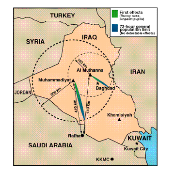 To assess possible hazards to U.S. forces from CW agent releases at Muhammidiyat and Al Muthanna, atmospheric modeling was conducted for the CIA for all possible bombing dates at each site. This modeling indicates that on the bombing date when southerly winds were most pronounced, Muhammidiyat releases, at worst, would have resulted in downwind contamination for up to 300 kilometers (km) at general population exposure levels established by DOD. This modeling also indicates that on the bombing date when southerly winds were most pronounced, Al Muthanna releases, at worst, would have resulted in downwind contamination for up to 160 km at general population exposure limits. (The general population exposure is a threshold at which one would not expect to see characteristic signs and symptoms of CW agent exposure.) During the air war, the nearest U.S. personnel were in Rafha, Saudi Arabia-more than 400 km from Muhammadiyat and Al Muthanna. Figure 2-2 depicts the locations of the damaged munitions and the closest U.S. forces during the Gulf War.35,51,148,158,162,274