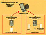 The M258A1 skin decontamination kit replaced the M258 in 1982[151] and consists of a plastic case and six packets (Figure 8[152] ). Three packets are marked "DECON 1 WIPE" and each contains a gauze pad soaked with a decontamination solution. The other three packets are marked "DECON 2 WIPE" and each contain a gauze pad and glass ampoules filled with decontamination solution. Instructions for use are marked on the case and packets.[153] Common usage when discussing the M258A1 kit is to omit the A1 designation.
