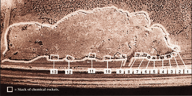 Figure 27. Pre-demolition imagery of the 600m x 150m Pit, showing the 13 stacks of rockets