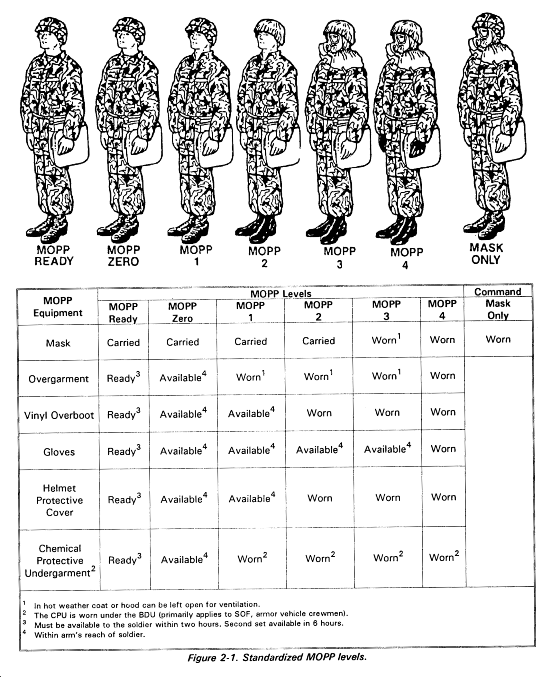 All leaders need to be familiar with standard MOPP levels. Knowing these levels will aid the commander or small unit leader in making rapid and educated decisions regarding the level of MOPP to be worn by his soldiers. Standardized MOPP levels allow commanders to increase or decrease levels of protection through the use of readily understood prowords. Commanders determine which protective posture their subordinate units will assume (Figure 2-1), and then direct their units to assume that MOPP level.