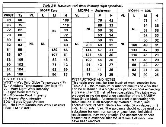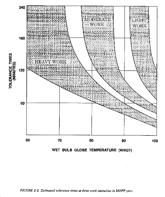 If the commander considers MOPP4 for the 3d platoon, a review of Table 2-2 indicates that a work/rest schedule is inappropriate (no work/rest cycle is recommended for heavy work in MOPP4 at a WBGT reading of 80�F), and Table 2-4 shows that continuous work of only 32 minutes would be possible before incurring an initial risk (5 percent) of heat casualties.