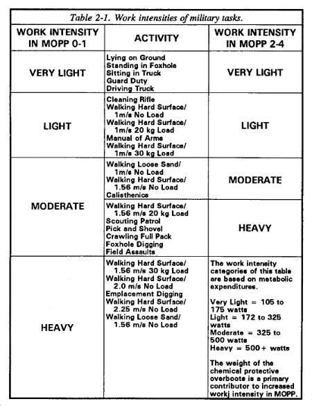 MOPP analysis must consider the work intensity the mission will require and how long this work load must be maintained. Is time a critical factor in mission success? What will be required of the troops after achieving the mission objective? Can they rest? Must they dig-in and defend in place? These are some of the critical questions the commander must answer in proceeding with a MOPP Analysis. The commander can first estimate the work intensity required to perform the mission using Table 2-1 as a guide. Then, based on knowledge of the environmental conditions, Table 2-2 (daylight) or Table 2-7 (night or shade) can be used to provide guidance on work/rest cycles that can sustain work over long time periods. The guidance in that table assumes that the commander is unwilling to sustain more than minimal (5 percent) heat casualties.