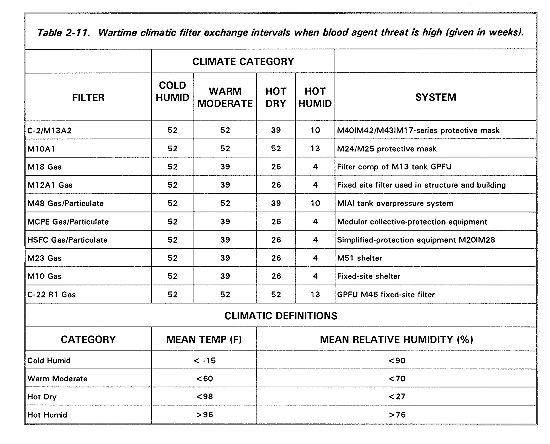 Before initiating filter exchange, leaders consider the implications for their units. Some considerations are:The decision to change filters is driven by two considerations: the amount of chemical agent the filter has been exposed to, and the time the filter has been exposed to the atmosphere. These separate considerations are based on the two mechanisms by which the filter provides protection from chemical agents. For all agents, the filter uses mechanical filtration and absorption as the protection mechanism. Additionally for blood agent CK, the filter uses a chemical reaction. The chemical reaction mechanism is degraded by prolonged exposure to CK and the absorption capacity, by exposure over time to air, particularly hot humid air (see table 2-11).