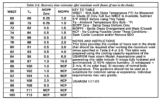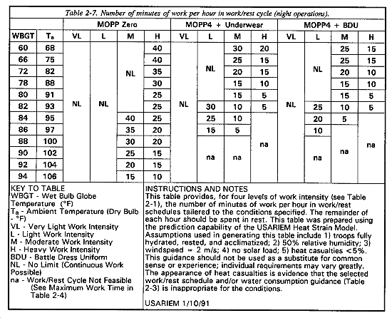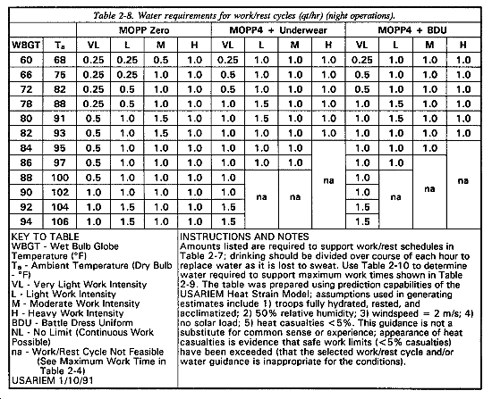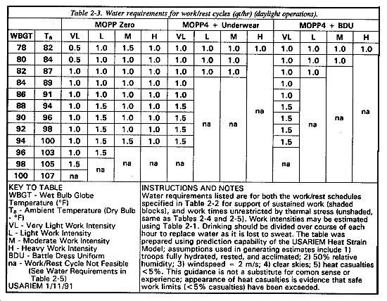 Water requirements should be estimated using the guidelines provided in Tables 2-3, 2-5, 2-8, and 2-10. Base the recommended hourly replenishment on current work intensity, temperature, clothing layers, and light cycle. For example, at a moderate work intensity in MOPP4 (over underwear only) and a daylight wet bulb globe temperature (WBGT) of 80�F (27�C) a soldier should drink approximately 2.0 quarts of water per hour if working continuously or 1.0 quart per hour if working according to the work/rest schedule recommended in Table 2-2 (for example, 10 minutes work, 50 minutes rest). Note that continuous work under these conditions may lead to heat casualties after 49 minutes (Table 2-4).