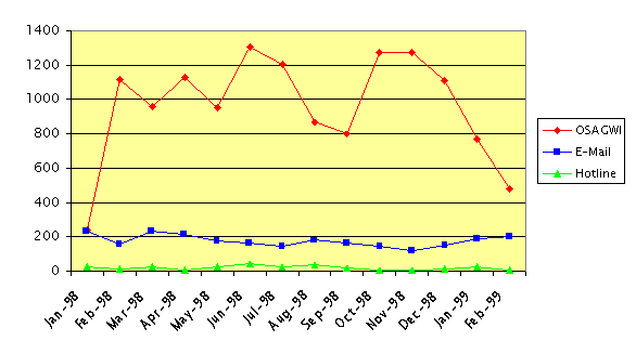 The top line of the chart above depicts the total number of attempts made by the OSAGWI outreach staff from January 1998 through February, 1999 to contact Gulf War veterans with information concerning their Gulf War experiences or in response to veterans’ inquiries. The outreach efforts also respond to person-to-person contacts during town hall meetings, military base visits, and other public events. The two bottom lines represent the number of incoming correspondence via e-mail (squares) and calls to our 1-800 Hotline (triangles). Overall, OSAGWI’s monthly outreach efforts significantly exceed the number of monthly incoming inquires, typical of OSAGWI’s commitment to reach Gulf War veterans with information about our ongoing investigations.