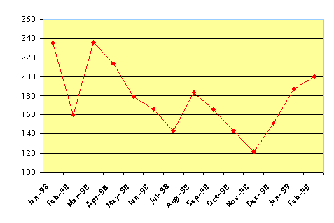 This chart depicts the slowly decreasing numbers of e-mails received by OSAGWI between January 1998, and February 1999 from Gulf War veterans and other individuals with Gulf War-related questions or comments. Although there was an increase in the trend from November, 1998, through February, 1999, the overall number of incoming correspondence is decreasing.
