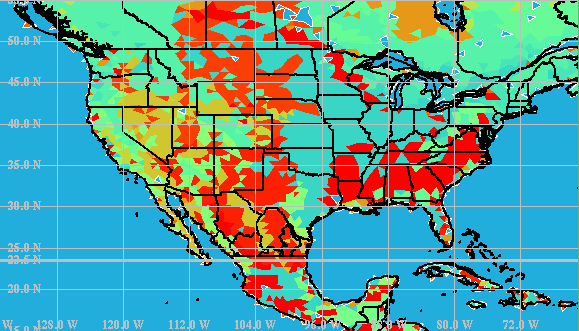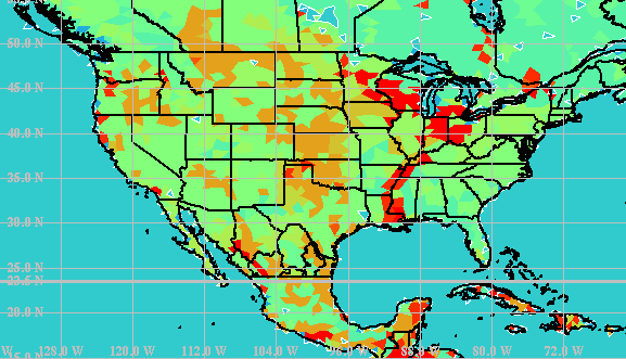 Figure 7. OMEGA back-trajectory analysis. Here the trajectories of all of the pseudo-releases passing through a Global Atmospheric Radionuclide Detection System (GARDS) station for 24 hours are shown as well as the percentage of trajectories originating at each location. OMEGA was designed for existing CRAY class super-computers with a goal of being operational on a Teraflop (sustained) class machine by 1997. This class of machine will enable OMEGA to operate with hemispheric resolution that is better than today's global models, and with a highest resolution of 1 km. OMEGA is dynamically memory managed, however, and thus is capable of operating on workstations, albeit not operationally with 1 km resolution over a large area. OMEGA is currently operational on IBM RS/6000, SGI Onyx, and DEC Alpha workstations. OMEGA has valuable applications in numerous weather prediction and aerosol transport problems. The model can play a major role in short and medium range weather forecasting, especially of systems that are influenced by topography and other surface features. It will also be able to address environmental problems ranging from urban air quality and compliance with U.S. Environmental Protection Agency regulations to emergency response to toxic releases. Further information on OMEGA can be obtained from Dr. David Bacon, Director, Center for Atmospheric Physics, Science Applications International Corporation, 1710 Goodridge Dr., McLean, VA 22102. Dr. Bacon may also be contacted by phone at (703)821-4594, by FAX at (703)821-1134, or by e-mail at bacon@apo.saic.com. |