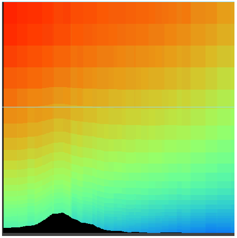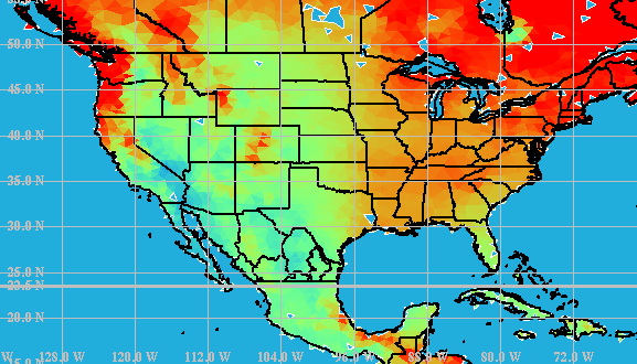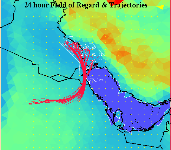 (d) Figure 6. Examples of XGRID, the X-windows graphics post-processor for OMEGA. XGRID permits the display of: (a) OMEGA products overlaid on Digital Chart of the World mapping information; (b) vertical slices through the OMEGA output; (c) standard skewT-logP sounding diagrams; and (d) the Eulerian (grid based) and Lagrangian (particle or puff) dispersion results. A recent addition to OMEGA is a back-trajectory analysis system. Using the pseudo-release capability of OMEGA, and post-processing tools, OMEGA is capable of providing information on the likely point of origin of a pollutant. Figure 7 shows a demonstration of this capability in which pseudo-release trajectories were post-processed to display only those that passed through an observation point during a given 24 hour measurement period. The points of origin of those trajectories form a field-of-regard for the station and the number of trajectories from a each release point that pass through the observation point can be used to determine the probability of release contours shown in white.
