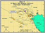 Figures A-51 through A-53 show dosage contours representing acute (first noticeable effects) levels from the early stages of evaporation from the wood and soil, characterized by relatively high mass flux. Northerly winds prevailed during the first day and hence downwind dispersion extended acute levels approximately 20 km to the south (Figure A-51). According to the USACHPPM overlays, no troops were located in these areas south of Khamisiyah on March 10, 1991; hence, no acute exposures occurred. The winds diminished on the second day. Figure A-52 shows that the acute dosage contour for the second day lies essentially within that of the first day. Evaporation rates diminish rapidly over the last two days (March 12-13, 1991), reflected in Figure A-53, which shows dosage levels falling below the acute level on the third day. Consequently, the modeling results predicted no exposure to acute levels for any units due to the release of chemical warfare agent at Khamisiyah.