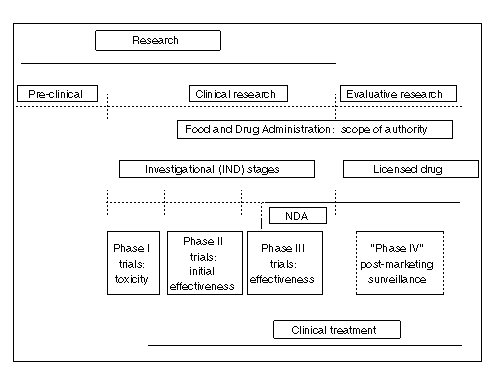 The continuum is portrayed graphically in Figure 1, which depicts "research" and "treatment" (at the top and bottom of the figure) as overlapping. We can say the following about this depiction. First, research encompasses preclinical, clinical, and evaluative activities occurring after a medical innovation is introduced to clinical practice. But not all clinical research is therapeutic, i.e., intended for the benefit of the individual research subject. Phase I and Phase II trials may or may not benefit the individual human subject, who is a volunteer, but may be intended solely to generate scientific knowledge of benefit to future patients. However, much clinical research is intended to generate both scientific knowledge and therapeutic benefit to the individual subject of research. Moreover, much therapy clearly lies beyond the research stage. For clinical procedures, however, no clear demarcation of the boundary between research and treatment exists, whereas in the case of drugs, the boundary is defined as an artifact of FDA regulations.