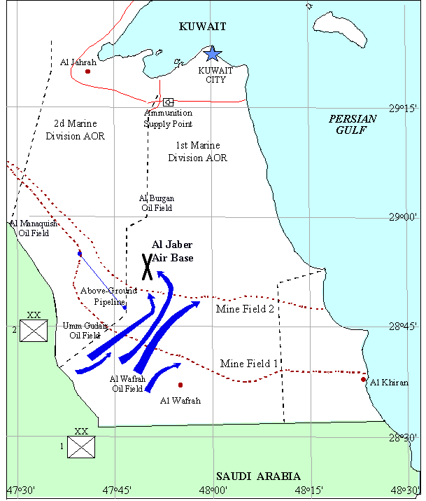 Combat Engineers of the 1st Marine Division, working in cool, drizzly, and heavily overcast conditions due to weather and oil smoke, opened four assault lanes in the first minefield by 0715 hours and four more in the second minefield by 1230 hours.[16] By 1420 hours, all 1st Division lanes in both minefields had been opened. Forces of the 1st Marine Division passed quickly through the breaches (Figure 3), encountering no resistance in the first minefield and overcoming light resistance through the second minefield. They proceeded to Al Jaber air base by evening. According to 7th Marine records,[17] Task Force Ripper (the Divisions lead maneuver element) logged no potential or actual exposure to chemical warfare agents throughout all breaching operations.