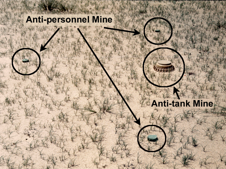Figure 22. Iraqi mines in Kuwait. The large center mine is an anti-tank mine, surrounded by three anti-personnel mines.