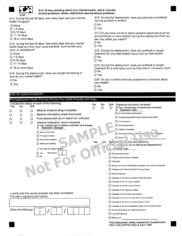 Initial Post-Deployment Health Assessment Questionnaire (back), April 1997
