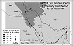 The drifting composite plume sometimes took the form of stratified layers separated by clean air. The movement of smoke in multiple layers was due to unstable conditions and the occurrence of temperature inversions above ground level.[113] As the plume traveled, the contaminants became more dispersed and more diluted. The highest concentrations of contaminants were in the areas nearest the oil fields and short distances downwind.[114]