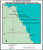 Real-time measurements (i.e., levels were obtained at the time samples were taken) of H2S, SO2, VOCs, and TSP were obtained using portable equipment. Initial monitoring in Kuwait and Saudi Arabia was carried out between March 13 and March 20, 1991, at 13 locations. These included the Meteorology and Environmental Protection Administration (MEPA) in Dhahran, Saudi Arabia; the US Embassies in Kuwait City and Riyadh, Saudi Arabia; Camp Freedom in Kuwait; Port Shuaybah in Kuwait; and several locations near the oil fields. A second round of monitoring was conducted between March 24 and March 27, 1991, at about 15 locations in Kuwait.[134] Figure 7 identifies the USIAAT’s sampling/monitoring locations.[135] Like the USAEHA monitoring that was to follow, these sites were selected to obtain real-time data in areas where US troops were located.