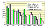 Figure 9 presents a comparison of monthly average data for respirable particulate concentrations at various locations within Kuwait in 1991 and 1994. A comparison of the particulate levels reveals that the 1991 levels were below 1994 levels for June, July, August, October and November and above for May and September. Health effects associated with exposures to particulate matter are discussed in Section V.