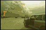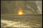 Although the composite smoke plume from the fires appeared to be black when viewed from satellite photographs, smoke color and density varied in individual fires. About 25% of the plumes from individual fires were observed to emit white or light gray smoke, while others emitted black or a mixture of black and white smoke.[106] Fires that produced white smoke were found to be highly enriched with sodium and calcium chlorides.[107] (See Photo 5). About 10% of the fires were from the oil lakes that produced the densest black smoke (see Photo 6). Photo 7 shows an oil lake that is not burning. In this photograph a pool of oil surrounds a "Christmas Tree" valve. A few of the fires emitted no visible plume at all. The differences in plume composition were the result of variations in the oil/gas/water mixture of the oil ejected from the wells, the compositional differences between the different oil fields, and the condition of the damaged well heads.[108]