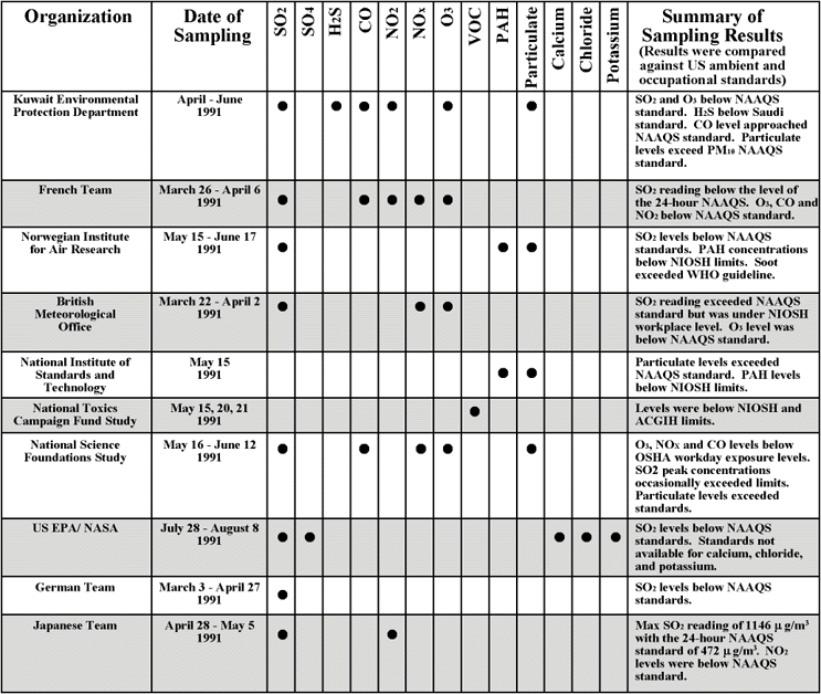 Environmental sampling conducted by various international organizations from March to December 1991 characterized emissions from the oil fires, war time related emissions, and background sources. On-going monitoring programs conducted by the Kuwait Environmental Protection Department defined air quality conditions prior to August 1990. These programs are further discussed in Section IV.D.