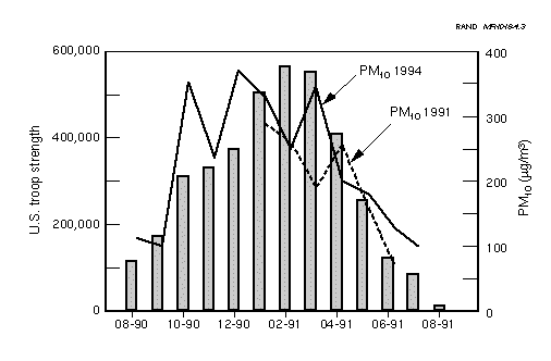 Mostly because of its location, the Gulf War and its concomitant exposures could explain some of the respiratory complaints and diseases reported by its veterans. In particular, the exposures may explain the difference in asthma and bronchitis levels found in the Iowa Study between military personnel who went to the Gulf and those who did not. Figure 4.3 shows the time distribution of U.S. troops from August 1990 to August 1991, when most troops were re-deployed from the Gulf, together with the monthly mean PM10 measured in 1991 and 1994. This graph shows that, when the PM10 concentrations started to rise in March 1991, about 500,000 U.S. troops were in the region and could have been exposed to PM10 levels higher than the NAAQS for several months.