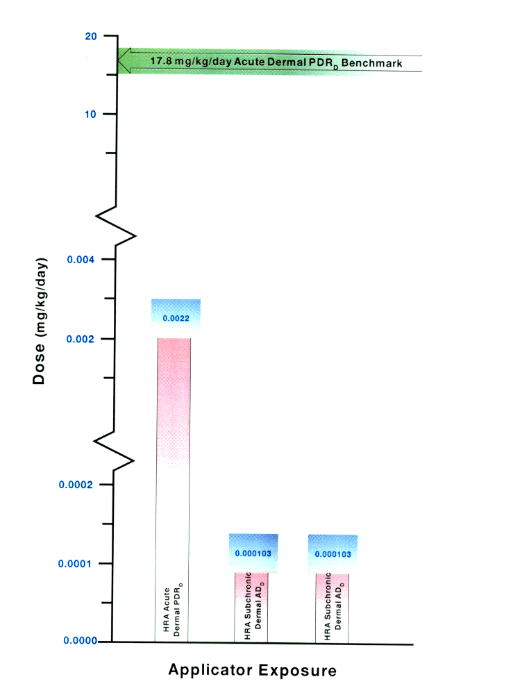 | Comparative representation of published human health risk to the HRA route-specific dose estimates. The above graph represents the lowest concentration of Permethrin at which human health effects occur in the literature compared to the HRA estimated exposure of Gulf War servicemembers. The arrow represents the most conservative NOEL for acute dermal exposure route from the human health effects studies. This level can then be compared to the exposure route that had the highest reported HRA dose estimate for all exposure levels. |