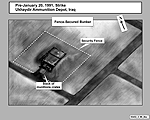 Once it was assessed that the mustard-filled rounds inspected at the Fallujah Proving Ground in 1991 were at Ukhaydir during the Gulf War, the intelligence community concluded that the damage discovered at the Fallujah Proving Ground might have occurred while the rounds were at Ukhaydir.[30] In 1997, after UNSCOMs first Ukhaydir inspection, but before its second, the intelligence community examined the available information to determine how the rounds became empty and when the damage could have taken place and whether any mustard agent that may have been released reached US forces located in Saudi Arabia. After an extensive investigation, which included a review of photography from the Gulf War, the intelligence community determined that Iraq stacked the mustard-filled rounds in the open in several areas throughout the Ukhaydir Ammunition Storage Depot. They placed one large stack directly in front of the fenced bunker later inspected by UNSCOM. (See Figure 9.[31] ) The intelligence community believes the damaged and empty munitions inspected at the Fallujah Proving Ground were in this stack. As the intelligence community noted, "other similar stacks were located in the open at various locations in the depot, but no other stacks were damaged."[32] The intelligence community also assessed in 1997 that it was possible no rounds were damaged at Ukhaydir during the Gulf War. However, since some rounds were damaged at some time, the damage could have occurred during two separate Coalition air strikes on Ukhaydir, the first on January 20, 1991, and the second on the night of February 13/14, 1991.[33,34]
